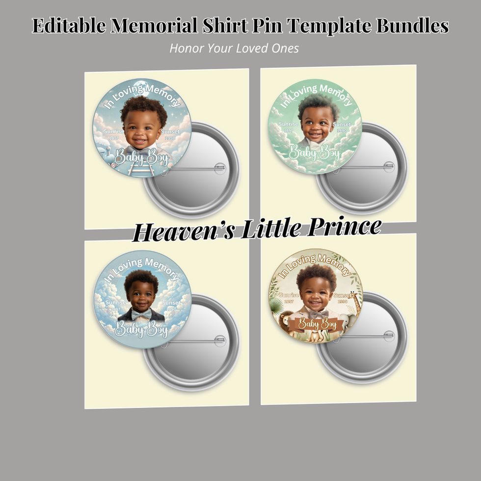 Celebrate the life of your baby boy with this delicate collection of editable memorial shirt pin templates. Each design features soft tones, angelic elements, and a tender touch to honor your little prince in the most beautiful way. Fully customizable — perfect for services, keepsakes, or gifts for grieving families.